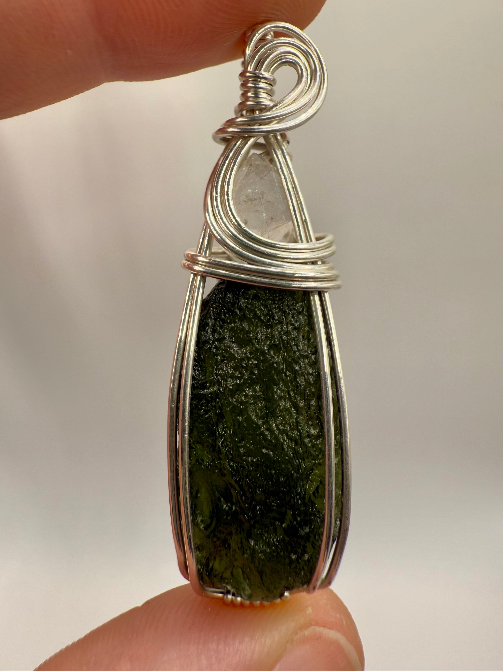 C11) Chlum Moldavite & Herkimer Diamond Pendant Necklace In Sterling Silver
