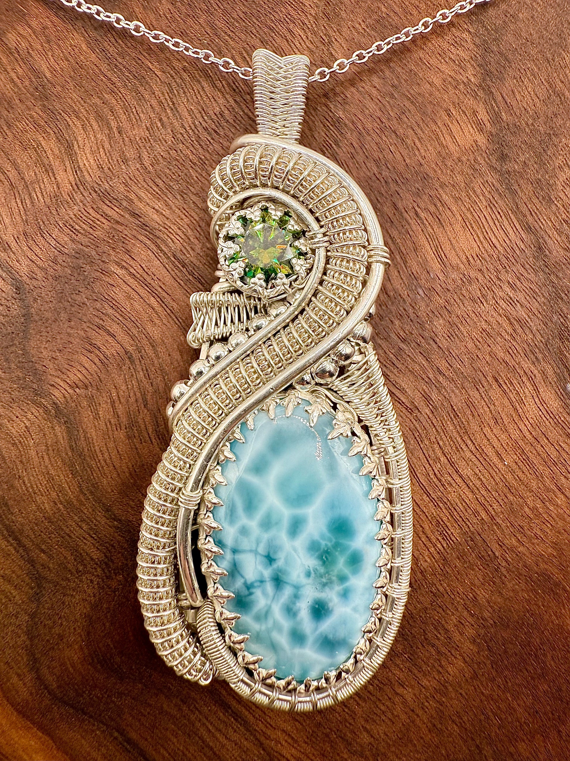 F112) Large Larimar & Green Mossanite Pendant Necklace In Sterling Silver