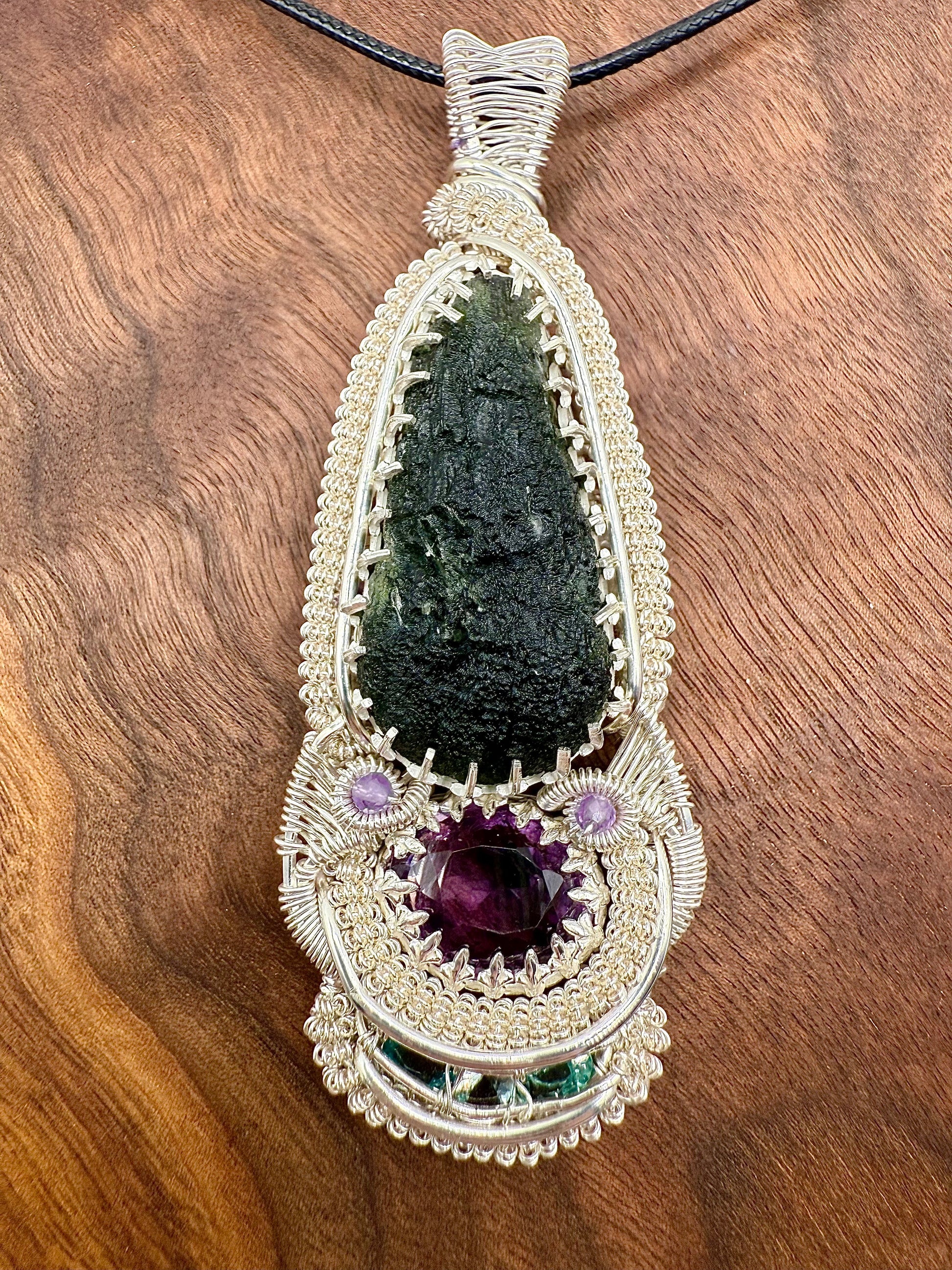 GG33) Large Moldavite, Amethyst, Aquamarine, & Blue Apatite Pendant Necklace In Sterling Silver