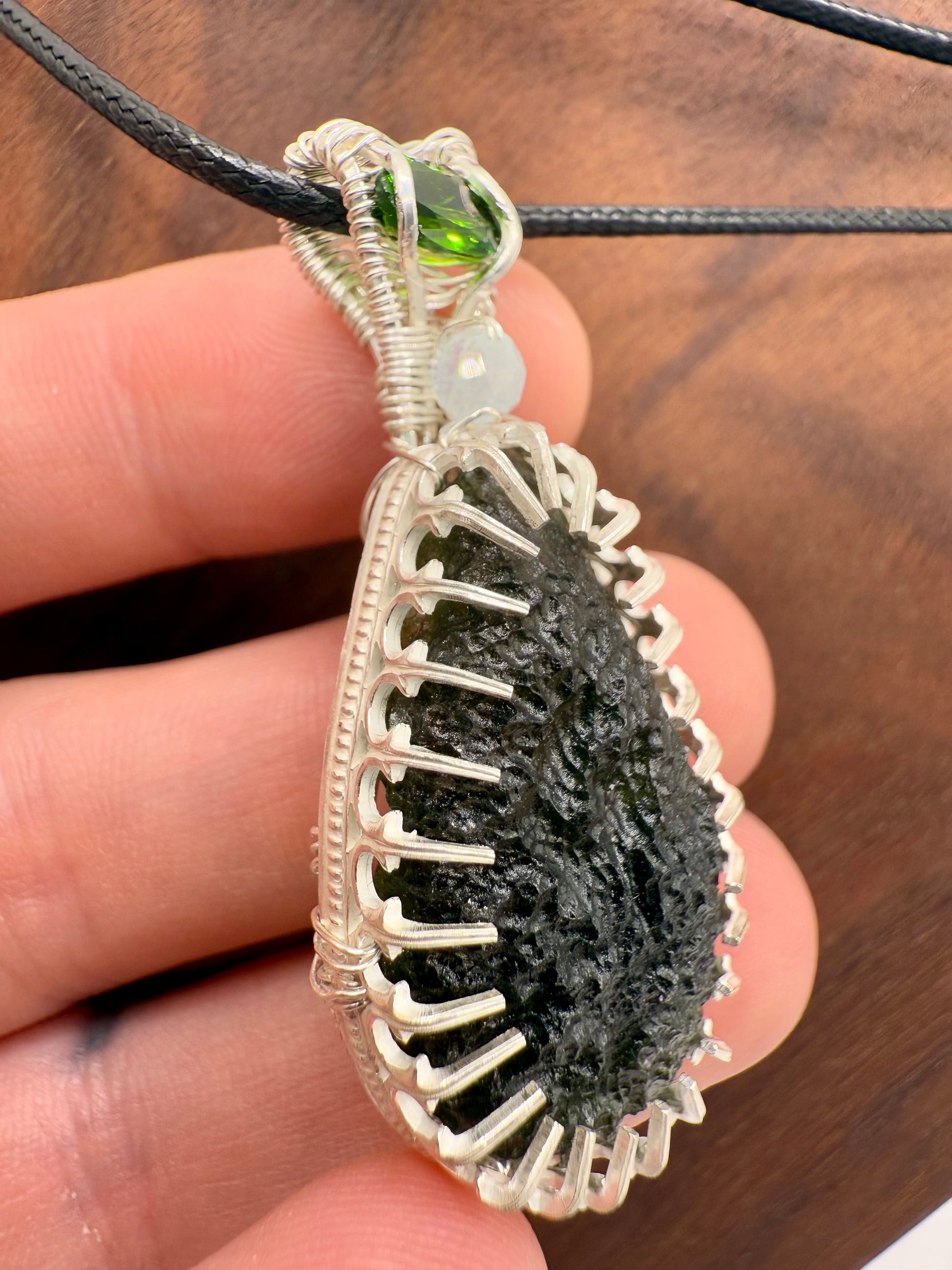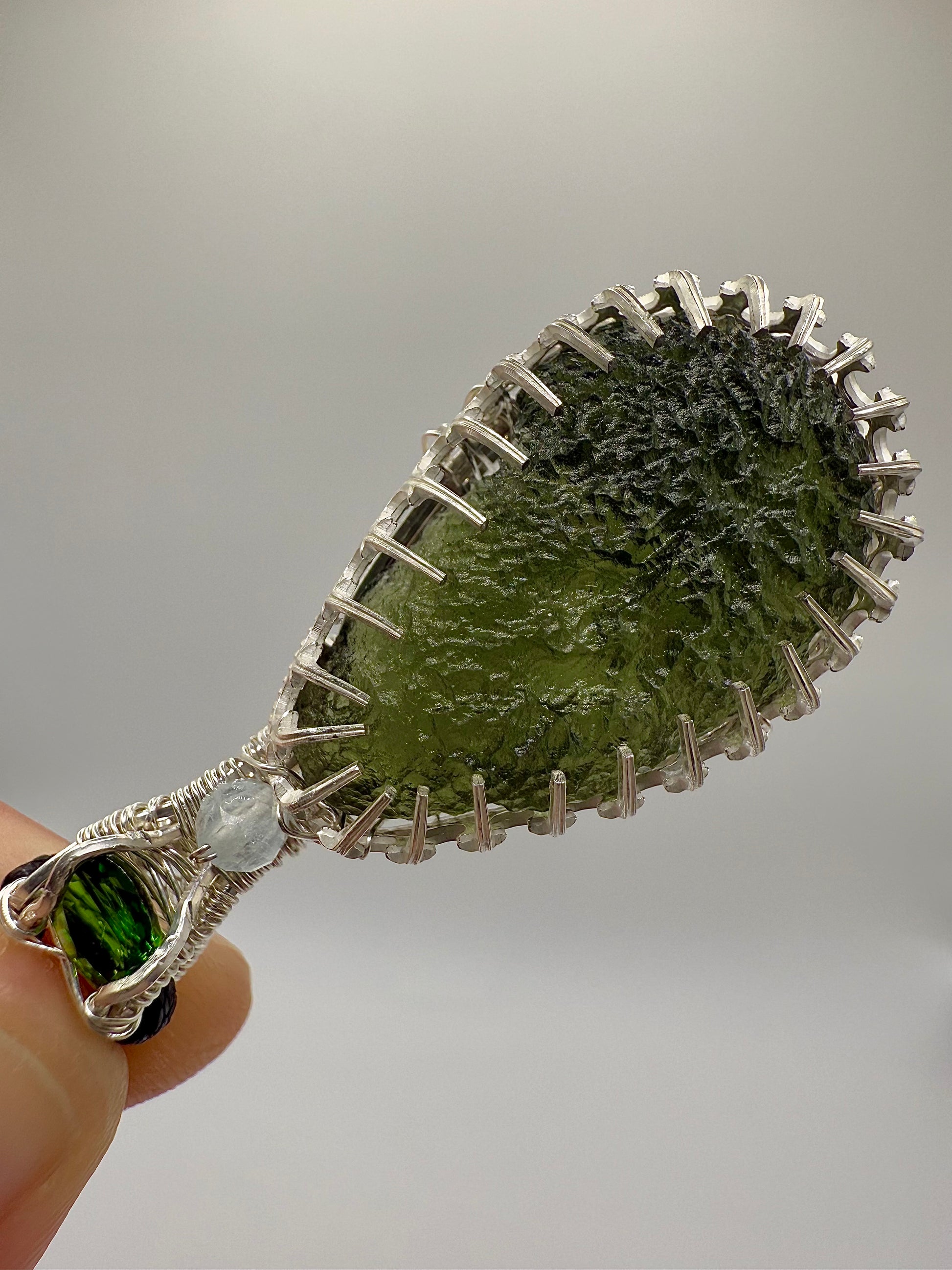 C112) Moldavite, Chrome Diopside, Aquamarine Bead, Pendant Necklace In Sterling Silver