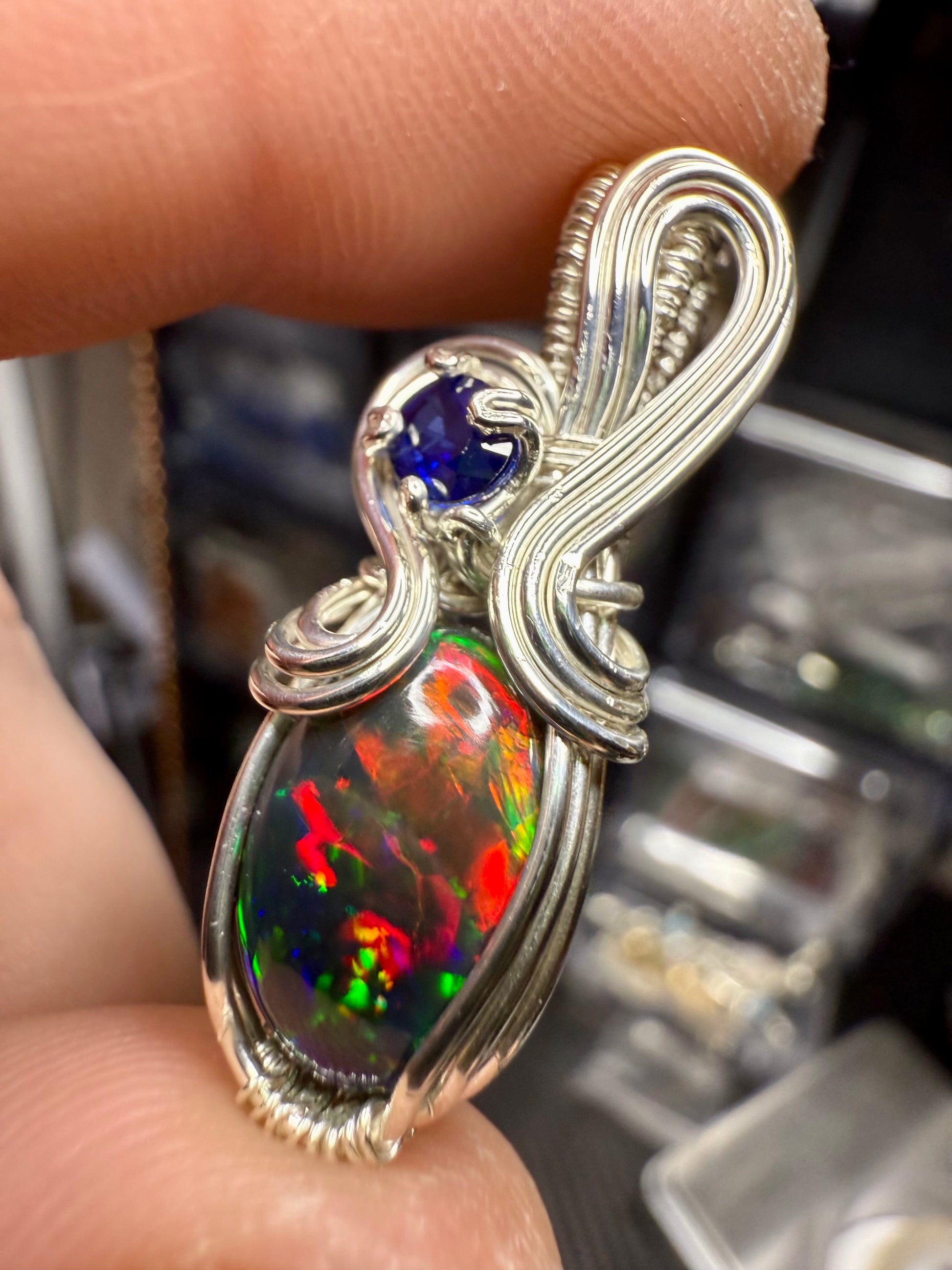 ZZ12) Opal & Sapphire Pendant in Sterling Silver